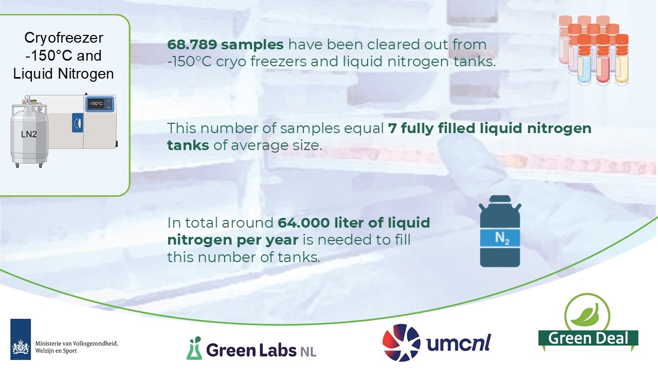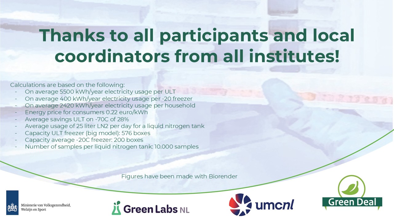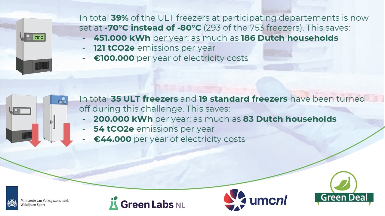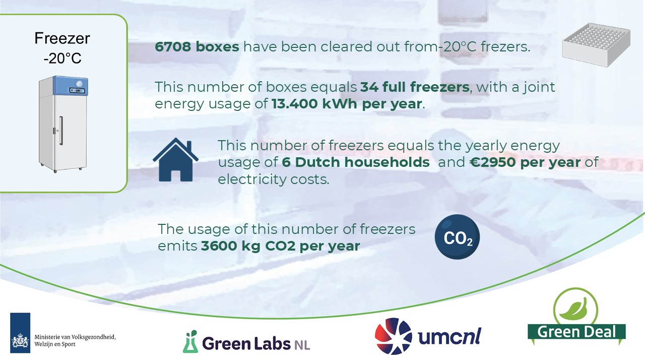In addition, by applying more efficient storage approaches, such as centralisation, 19 –20°C freezers and 35 ULT freezers could be fully switched off. This alone results in annual savings of 200,000 kWh, €44,000 and 55 tonnes of CO₂ emissions — comparable to the energy use of around 83 average Dutch households.
